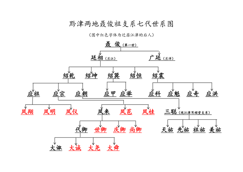 四百多年后,其子孙遍黔渝,布四海,尤以祖公之三子应朝公江津后裔,人丁兴旺,家族繁盛,政军界层面有聂帅、聂力将军、前川省政协主席荣贵等为国效力,商界层面有以江津的坤伍、坤刚、高贵、坤祥、坤培、坤会、坤明......等叱咤风云的商界大佬,令人久仰也!