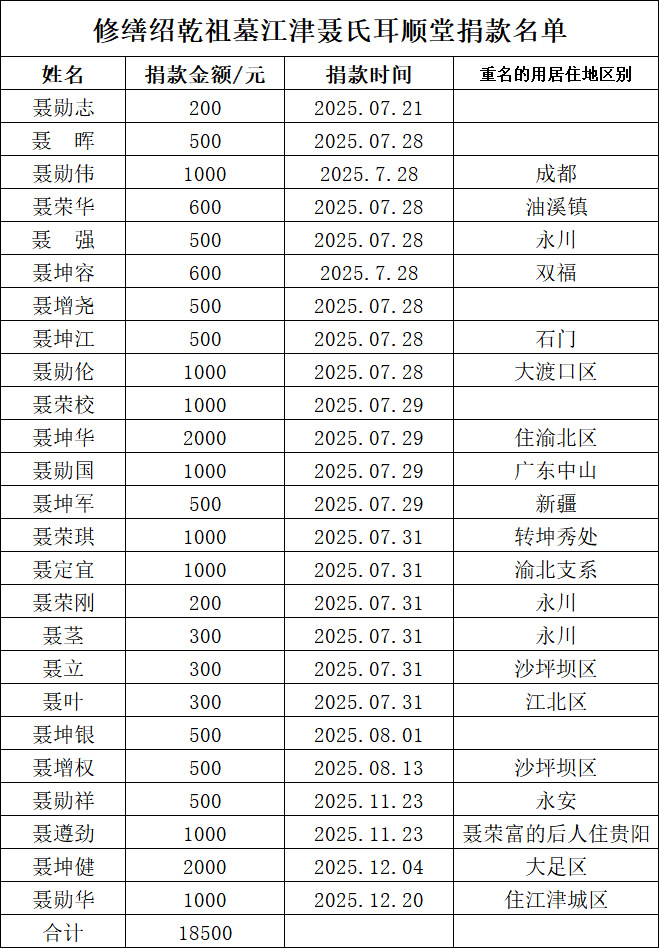 江津聂氏耳顺堂向修缮聂绍乾祖墓负责人转赠前期捐款