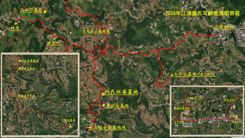 1、4月5日上午8点正在三圣社区集中,然后集体去向在三圣地区的六位祖辈开展祭祀活动(包括,刘氏祖婆、三聪公、天祐公、先祐公、美祐公、大怀公,因祖祐公不在三圣)。此次活动因交通问题,族人可根据自身情况选择性参加,没有去三圣的族人可先到大坡生态园等候。